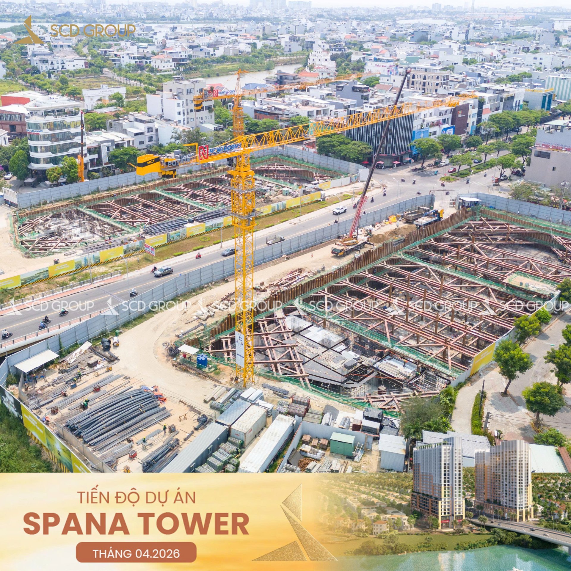 Từ trên cao, dự án hiện lên như một tổ hợp kiến trúc hoàn chỉnh với các tòa tháp đã lên kính, phản chiếu không gian đô thị năng động và cảnh quan sông nước đặc trưng của thành phố.